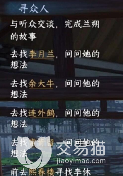 第一个步骤就是接任务,在哪里接任务呢,点开传闻就知道了,传闻当中有杭城一梦这个奇遇任务,接下这个任务之后,任务当中会给少侠一些提示的,顺着提示就找到江边的草丛那,这里会有一个NPC名叫兰朔,找到她然后和他展开对话,兰朔会告知任务的具体细节。
