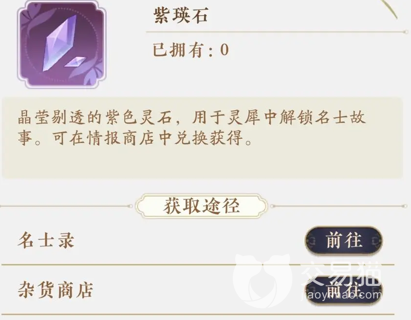 紫瑛石的获取渠道有两种,第一种是从杂货商店里进行购买,有的时候杂货商店会为玩家们刷出紫瑛石这种道具,玩家如果需要的话可以去买。另一种便是提升人物的好感来进行获得。名士的好感等级到达一定程度会给与紫瑛石。