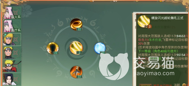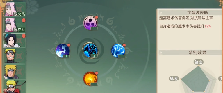 雷遁千鸟流是第二个技能,这个技能释放之后就会对施加的雷电印记进行引爆,引爆过后除了能够对对手造成伤害之外,还能够使得对手陷入眩晕的状态,具有一定的控制效果,火遁豪火球之术是三技能,是一个范围性很大的技能,对于推图来说是非常高效的一个技能,咒印之力是第四个技能,这个技能释放之后能够对佐助自身的各项属性进行强化,所以在这个技能使用期间对对手的伤害会附带自身的属性损伤。