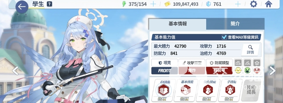她在游戏当中是一个温柔护士的形象,定位是一名坦克可以承受非常多的伤害能力还会降低敌方的防备力,专武信息则是救护的证明,救护的证明在游戏当中是她的武器散弹枪,在强化后还可以增加她骑士团的意志,积攒足够的材料就可以进行升级了。