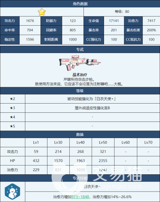 小护士芹娜的一些基本技能分别为:EX技能就是将其中一名队友移动到指定位置之后,对其进行治愈力120%-228%的恢复;每三十五秒恢复一名队友的技能为紧急治疗,恢复治愈力的94%-178%;被动技能白衣天使,可以提升芹娜自身治愈力的14%-26.6%;辅助技能天使的微笑,增强我方抵抗力的9.1%17.3%。
