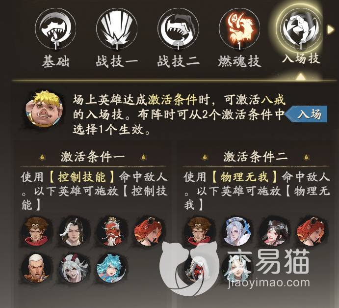 八戒的入场技能是一个比较强力的aoe控制技能,但是八戒的入场技能前置条件较为苛刻,需要几个比较难出的英雄,所以这个技能也比较鸡肋,在前置条件激活的情况下,八戒被换上场时,向地面旋转并且使敌人浮空,总共造成1700%左右的伤害,小编自己测试的情况下,这个伤害没有那么高,当处于燃魂状态下,八戒这个入场技能伤害非常高。