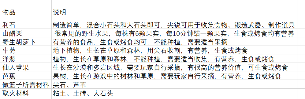 山醋栗是一种很普通的野生水果,在游戏里经常可以看到。每株醋栗有6颗果实,并且每十分钟就会结一颗果实。醋栗既有生吃也有烤熟,都是很有营养的食品。野生萝卜是一种地下植物,生长在草原或森林里。采集时必须使用尖锐的石块,而且为了避免这种植物的灭绝,建议将其种子先去掉。野生胡萝卜是一种很有营养的食品,既可以生吃,也可以烤吃。牛蒡是一种地下植物,生长在草原和森林里。玩家们必须用尖石来收割。牛蒡是一种很有营养的食品,既有生食,也有烧烤。不过,这东西不能栽种,因为它没有种子,也不能长出新芽,必须要适当的采摘才行。