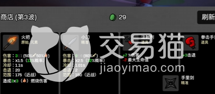 小编这一把暴君用的是手里剑,手里剑的适用性非常好,虽然上限不如弹弓高,但是前期手里剑的强度还是比较高的,如果大家前期没有强力的武器也可以使用一些低等级的武器先打工,暴君是不会缺钱的,所以不用担心浪费钱买武器,外星绅士这些增加怪物数量的物品看到了也可以拿一拿,前期多打钱,而且前期怪物血量不多,这些增加怪物数量的基本都是直接给玩家送钱。