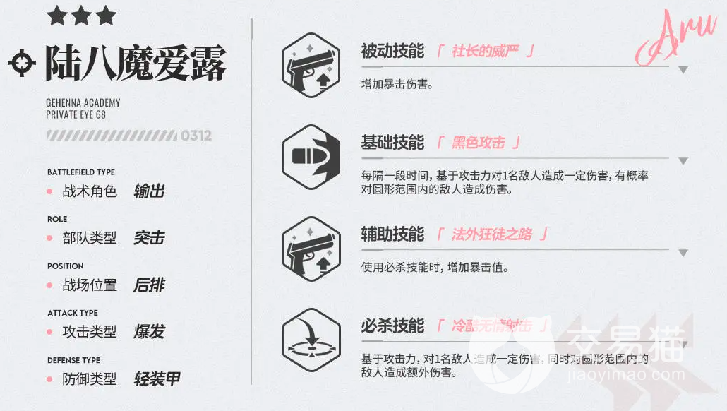 再来看看她的技能,陆八魔爱露的必杀技能叫冷酷无情射击,这个技能可以对一名敌人造成伤害,而且同时会对自己圆形范围内的敌人增加额外伤害。她的辅助技能是用于必杀技能时增加必杀技能的暴击值的,所以这两个技能要一起用。他的基础性能是隔一段时间就会对一名敌人造成伤害并且对局内有概率会对圆形范围内的敌人造成伤害。她的被动伤害跟辅助技能差不多,也是增加暴击伤害,不过被动技能是单纯的增加暴击伤害,并不是针对于某一技能。