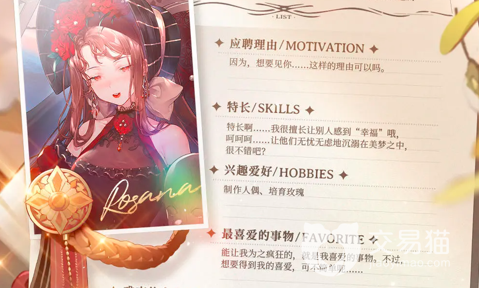 由于罗莎娜不知道自己的人生目标是什么,她遗忘了自己的过去,所以就连来乐园应聘什么职位她也不知道。身为女巫,罗莎娜擅长让别人有个幸福的美梦,更能让人沉溺在美梦之中,不愿醒来,对她来说这算是她的一个乐趣了。很少有事情能够引起她的注意,不过面对喜欢的事情,她也是会很狂热的。