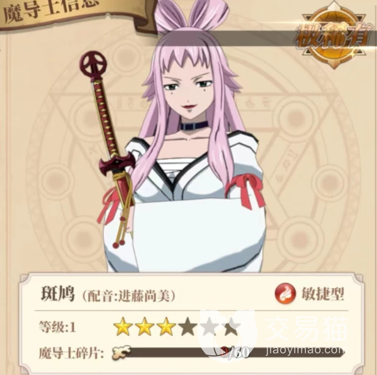 斑鸠是骷髅会三羽乌队长,外形是粉色长发的日本女武士,常用武器是日本太刀,初始就是超稀有的稀有度,等级1就带三星级。