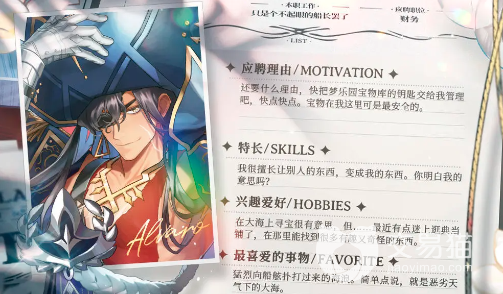 之前阿尔瓦罗最喜欢做的事就是在大海上去寻找各种宝藏,来到梦乐园之后就喜欢上了逛典当铺,他在典当铺里找到了很多有趣又古怪的东西。小编猜测这也是他来到梦乐园并选择待在梦乐园的原因之一吧,可以接触到很多自己之前并未接触到的古玩和宝藏,至于他会不会把梦乐园搅的天翻地覆,这个还有待观望。
