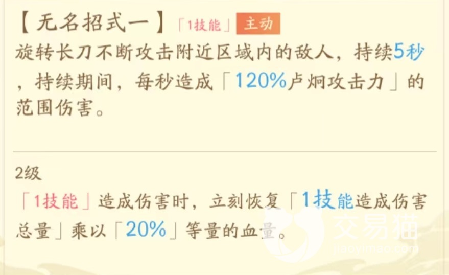 自身作为耐力型的平衡战士定位就是团队站桩坦克。绝技无名招式一。将手中长刀旋转起来,不断攻击附近区域,敌人持续5秒钟,在持续期间每秒钟都会造成范围伤害,升到三级之后除了伤害之外还能立即恢复血量和造成的伤害总量相关按照百分比加到自己身上,这是一个群体突出加吸血相结合的技能效果,是现在很多坦克都流行的设定,既有输出又能回血,使自己占的时间更久。