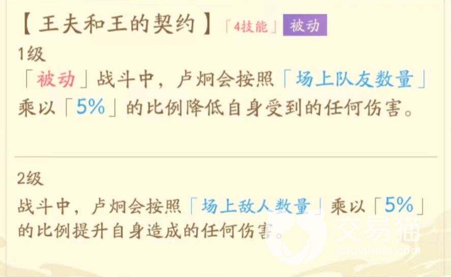 第3个技能五名招式三,以跳劈的姿势攻击敌人,造成伤害后使其在技能结束后三秒内降低防御力。最后一个技能是被动效果,在战斗过程中会按照场上队友数量比例来降低自身受到的任何伤害,这是其能够成为站桩坦克的真正原因,场上我方队友数量越多,降低伤害也就越高。当达到三级时,除了场上队友之外,连敌人数量也可以加进来。尤其是在战斗刚刚开始阶段,提升伤害降低效果是最明显的,对方很难打动。