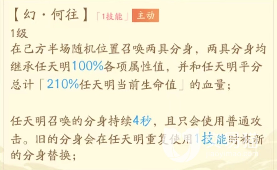 该角色在战斗中走的是持续输出路线,这和一些爆发型职业有着很大区别。绝技幻何往,在己方半场召唤出两具分身,分身可以继承任天明100%各项属性,并且平分当前240%生命值。这也就意味着召唤出幻象以后,本体血量会略有下降,但是多了两具分身,输出方面肯定会更强。召唤出来的分身持续最多6秒钟,只会使用普通攻击伤害敌人。