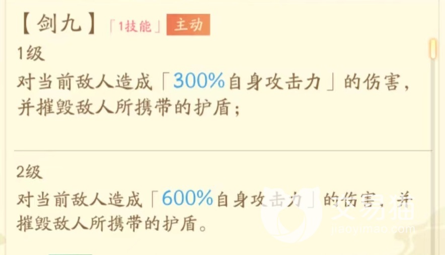 绝技剑九,对当前敌人造成伤害后能够摧毁敌人所携带护盾,达到三级时最多能造成900%自身攻击力伤害。单从该技能伤害数值上就已经远超过其他角色,可以说是目前非常犀利的单体点杀型选手,再加上自身作为精英肯定在属性上不会太差,配合上这样的高加成,对方残血敌人基本能做到一击秒杀。