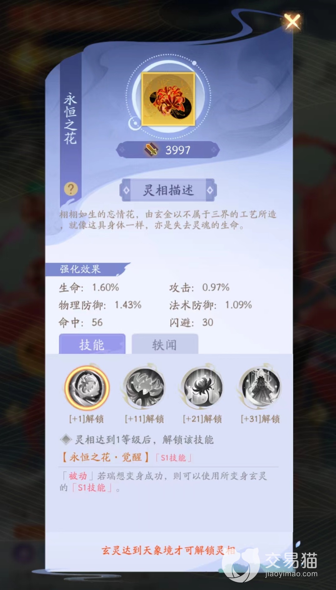 在灵相为永恒之花,依次解锁4个s级技能,这4个技能其实也很简单,就是对应解锁可以使用对方变身角色的4个s级技能。所以该角色的一切能力都是围绕着变身展开,如果能成功选择好关键目标,则展现出来实力非常强悍。如果变身不成功,则相当于我方废掉一名角色,影响也是很关键。同时也不能忽视对瑞想的强化,毕竟很多属性都是继承自身。