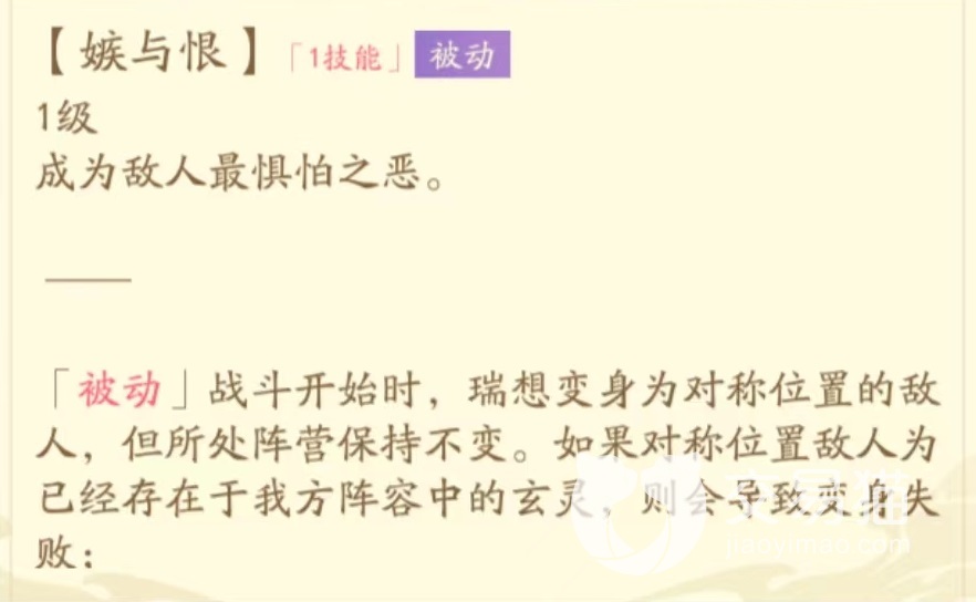 绝地嫉与恨,绝大多数绝技都是主动效果,而该角色却是被动,这一点非常令人意外。在战斗开始时瑞想变身为对称位置敌人,但所处阵营不变,如果对称位置敌人为我方已经存在玄灵,则变身失败。变身之后瑞想保持自身等级,境界,装备和灵相强度,获得对称位玄灵的品质,基础数值和基础属性。
