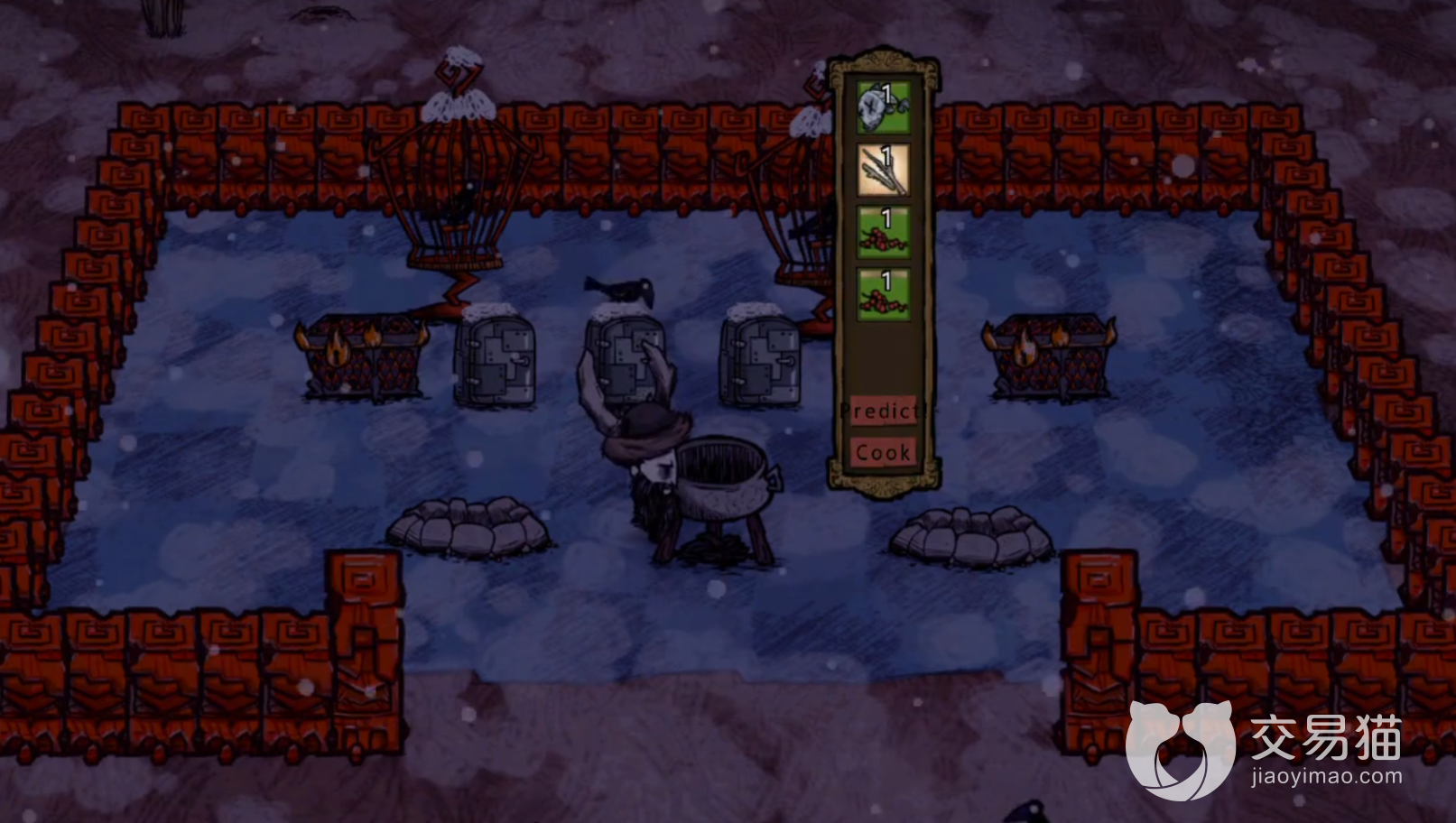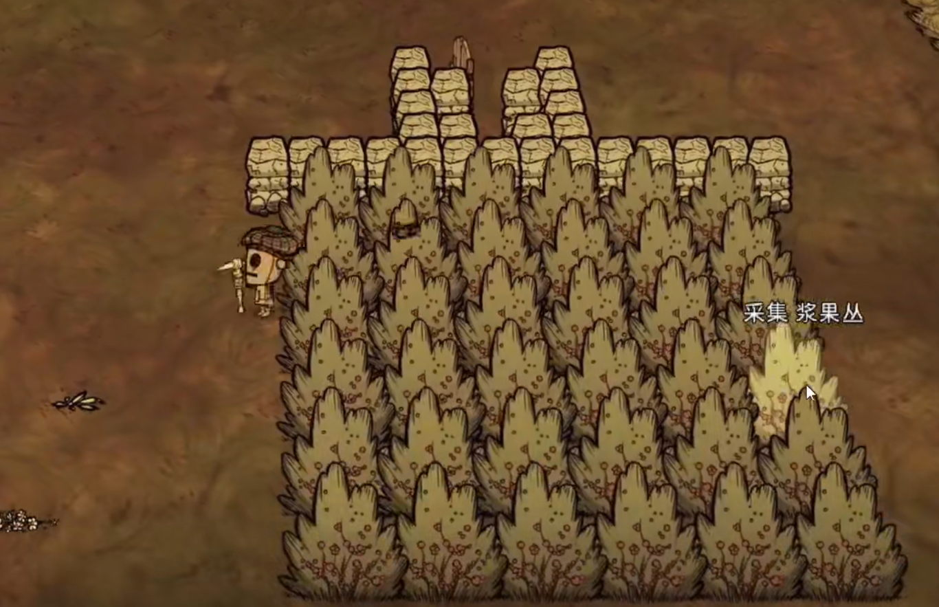最后一个就是最常见的前期食物--浆果,在野外多如牛毛大家还能将植被直接移植回自己的家园附近,方便采摘以及管理,偶尔还会刷出火鸡,非常的适合新手玩家培养,材料齐全之后将两个浆果放入锅里面就大工告成了。
