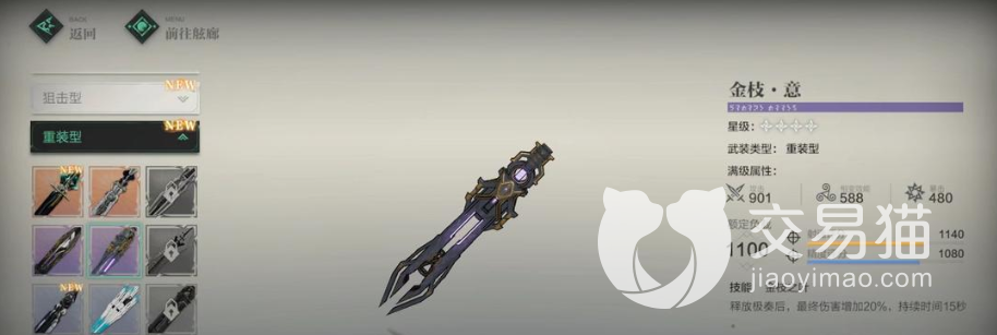首先,让我们来看看金枝意的属性。金枝意是一把重装型武器,它的攻击力和相变效能都比较高,分别为901和588(满级时)。它的暴击率为480,额定负载为1100,射速的评分则为1080,精度评分为1140。这些数据都显示出金枝意是一把攻击力强劲、稳定性高、适合近战输出的武器。