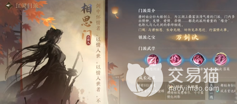 除了龙门客栈之外,游戏中最受欢迎的江湖门派就是相思门了,很多零氪玩家都很喜欢这个门派的服装,而且技能强度也非常的不错,玩家们可以获得三个技能,同时解锁办法也比较基础,在达成【丹虹开岐】获得【月下红线】之后就可以学习揽芳想携技能了,舞蹈身份达到6级就可以获得一线牵动技能,这个技能在与情缘玩家们一起挑战的时候会变成技能,但是单人的话效果没有那么好!
