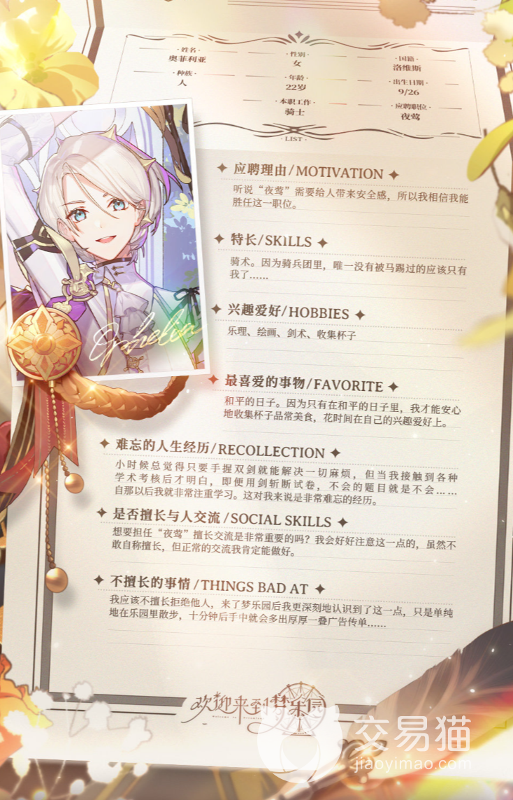 欢迎来到梦乐园是一个女性、冒险向的移动端新游,梦乐园中有各种绘风优美的少男少女角色,其中奥菲利亚是一个非常独特的女性角色,那么欢迎来到梦乐园奥菲利亚怎么样?在梦乐园里她不仅有着耀眼的银发和星辰般的眼睛,还有着坚毅的性格和温柔的心。本文将为大家介绍奥菲利亚这个角色的设定、剧情、服装和喜好,帮助大家更好地了解她的魅力。