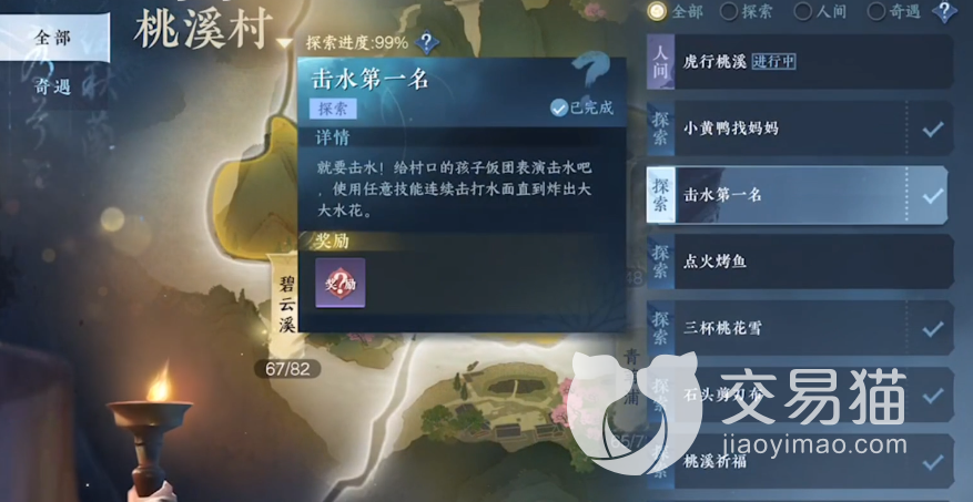 这个击水第一名的任务其实是跟技能有关的,触发的地点在桃溪村,也算是一个奇遇任务,等级是小吉,探索到桃溪村的时候大家就可以在(939,1180)的地点去找到具体的任务地点,到达这个地点之后大家要是看到的是一片水面就找对位置了。