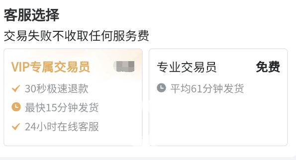 3.最后一点也是小编为什么会说交易猫是一款非常可靠的交易,首先在交易猫平台玩家的交易时间非常的便捷,而且在交易的过程中还会有专业的交易员免费的去帮助玩家进行交易,成为VIP的玩家还会有专属的客服24小时在线为玩家提供帮助,不仅如此即使交易失败平台也不会收取玩家的任何费用,保障玩家的利益。