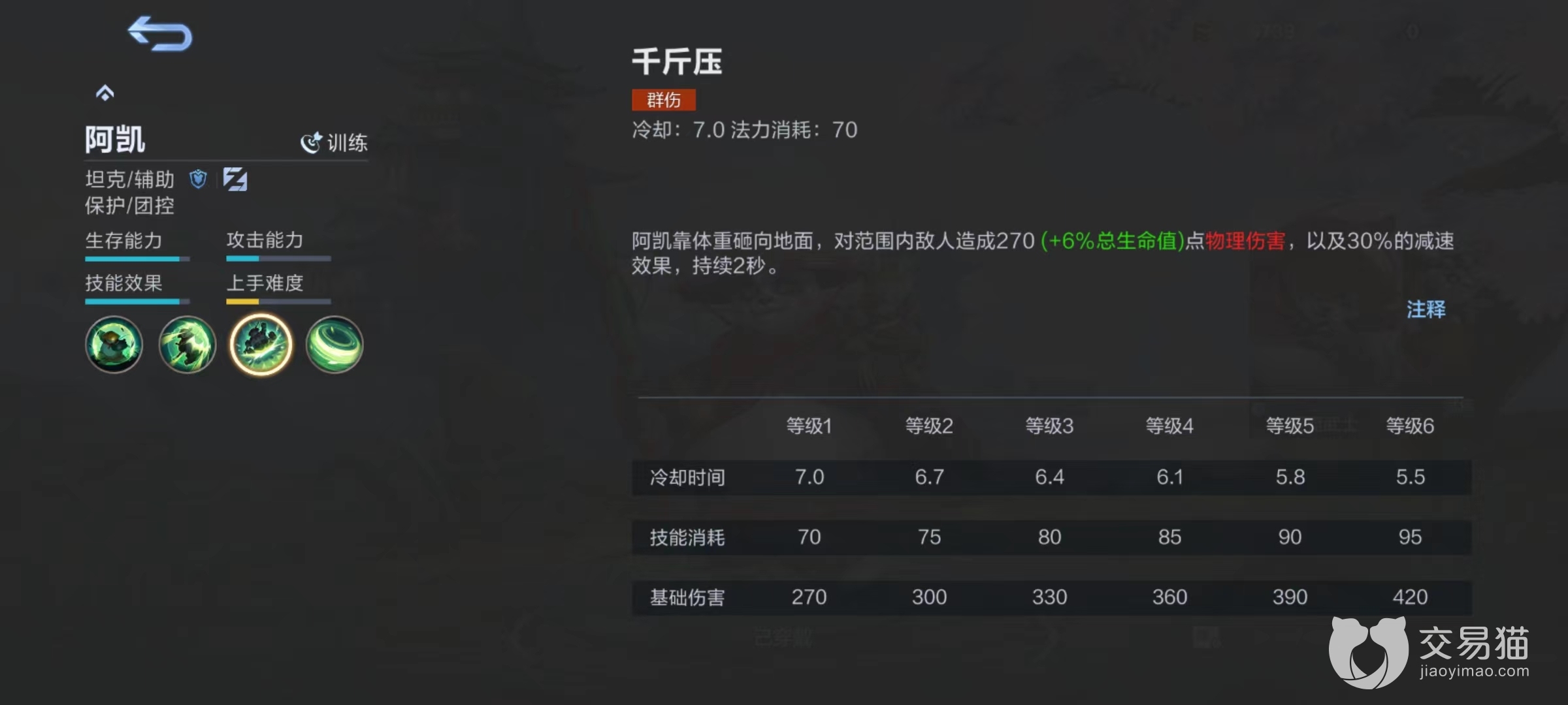 主动技能千斤顶,指定方向后冲出,对沿途所触碰到所有敌方单位造成物理伤害,如果碰到的是英雄目标,则将其击飞,并且向移动方向再翻滚一次。在进行位移时候可以穿越阻挡,这也是一种游走过程中常用手段。技能千斤压,群体伤害类型,依靠自身体重砸向地面,对范围内所有敌人造成物理伤害,并且施加两秒钟减速效果。最后一个技能千斤旋,在4秒钟之内旋转起自己身躯,持续撞击敌人造成伤害,并且击退目标。如果将敌方英雄撞飞之后,其在后退过程中也是可以继续冲撞其他角色。