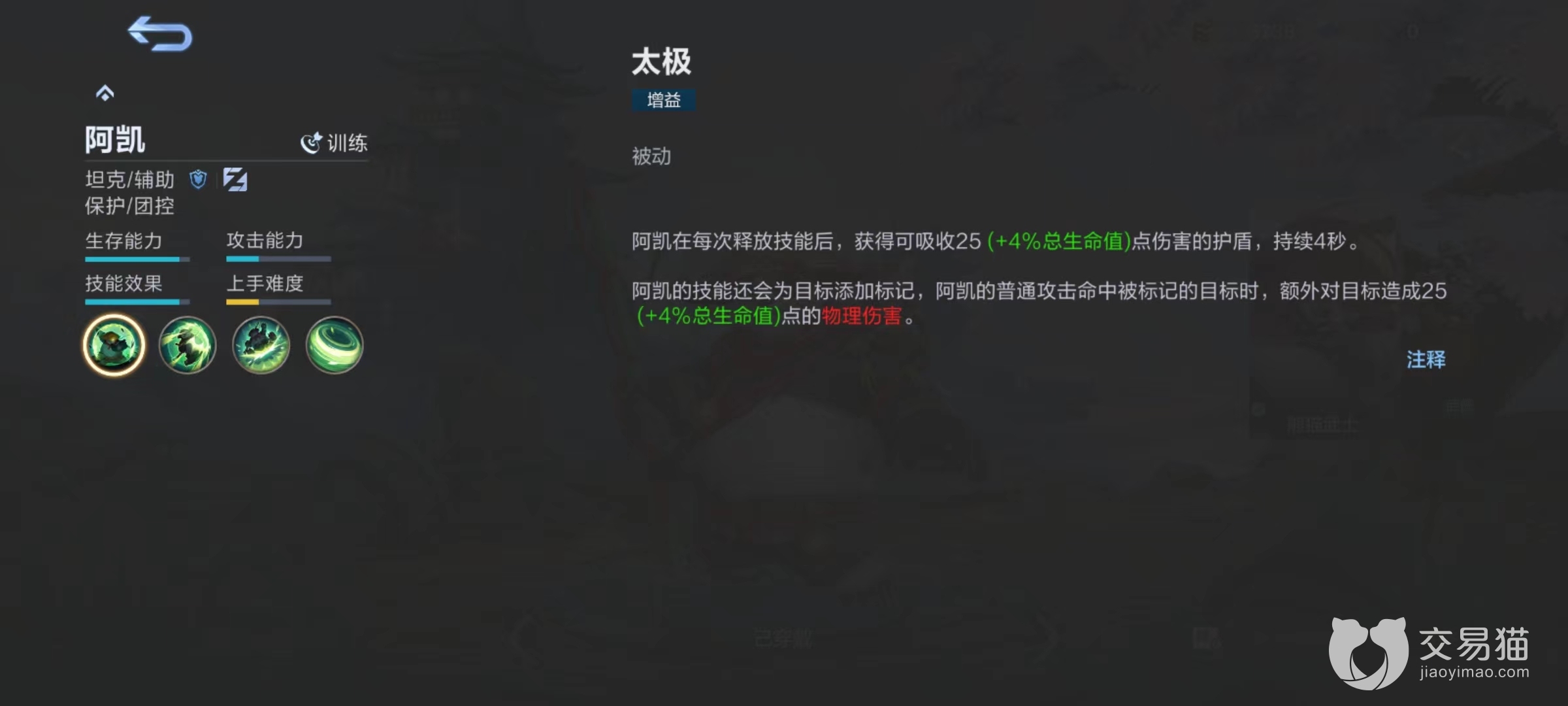 在形象方面就是一只手拿竹竿头带斗笠功夫熊猫形象,其他皮肤也都展现出了这一项特点,是游戏中非常具有中国元素的一名角色。自身被动太极,任意技能使用之后都能获得一个护盾,和自身当前总生命值相关,护盾将持续4秒钟。另外技能还会为目标添加标记,当普通攻击命中被标记目标时,额外造成物理伤害,这一项额外伤害和自己添加护盾在数值上是相等的。