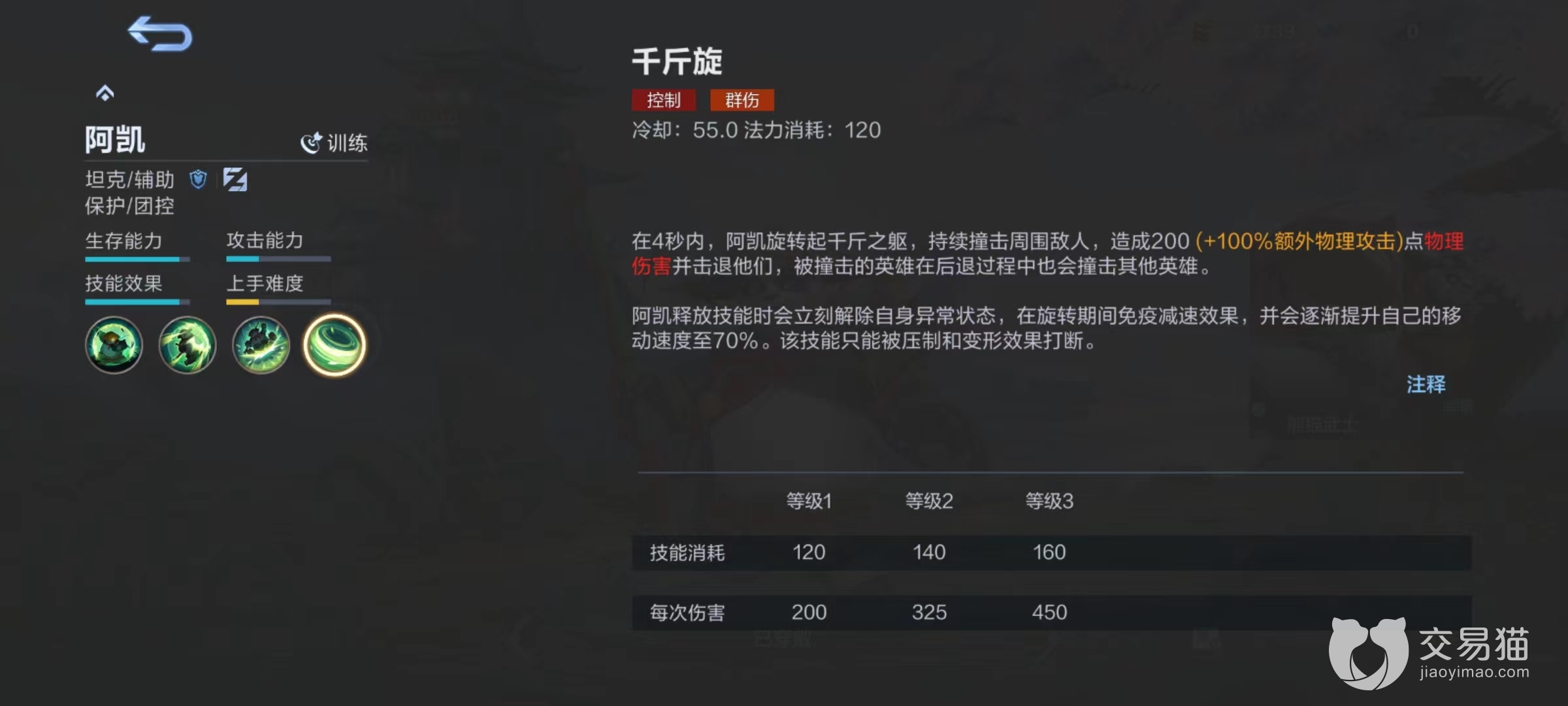 阿凯释放完该技能后,自身所有异常状态会立刻解除,并且在旋转期间免疫减速效果,还会逐渐提升自己移动速度,该技能可以被压制和变形效果打断。移动速度最多能提升到70%,这就带来了很好的应用空间,除了主要效果之外,完全可以将移动速度优势利用起来,追上残血敌人。