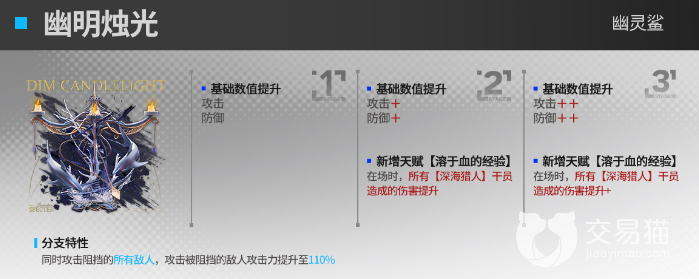 五星干员幽灵鲨作为深海猎人阵营干员,模组除了提高了攻击力和防御力之外,还能为她新增一个天赋,新天赋溶于血的经验可以提高所有深海猎人造成的伤害,深海猎人阵营之间阵营天赋都十分不错,单从模组看,强度不错,如果是喜欢深海猎人阵营的博士,那么这个模组就更值得开启了。