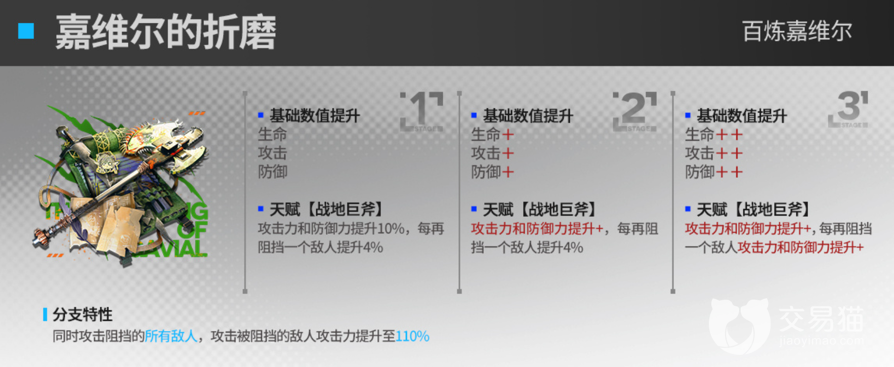百炼嘉维尔的模组嘉维尔的折磨,模组提高生命值,攻击力,防御力三项嘉维尔比较需要的属性,二级模组后,嘉维尔的天赋战地巨斧也得到了属性增强。嘉维尔阻挡数为3,作为强攻手的她承担着阻挡和输出的作用,本身就很需要攻击力增强清杂能力,需要生命值来提高生存能力,加之她三技能开启后会增加阻挡数至5,模组对战地巨斧的增强也是很实用的。