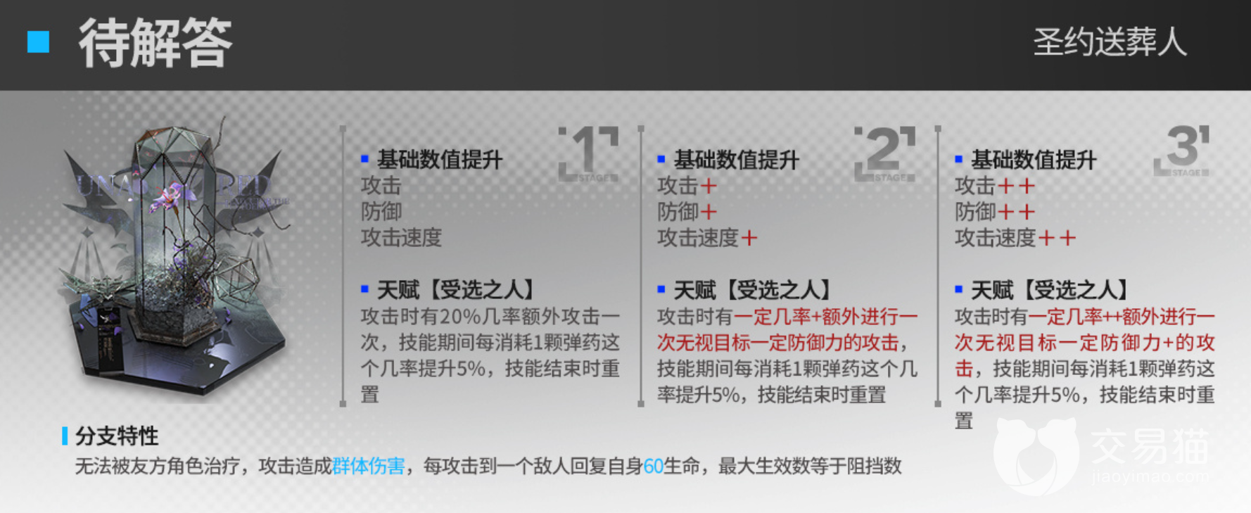 送葬人的三个技能都是攻击回复和弹药机制,攻击速度增加,既让圣约送葬人能够更快的开启技能,也让他输出速度更快。天赋受选之人,攻击时有概率额外进行一次无视一定防御力的攻击,让送葬人在技能真空期的输出能力变强了,额外攻击概率的提高,也变相提升了技能回转和三技能的总体输出,是个不错的提升。