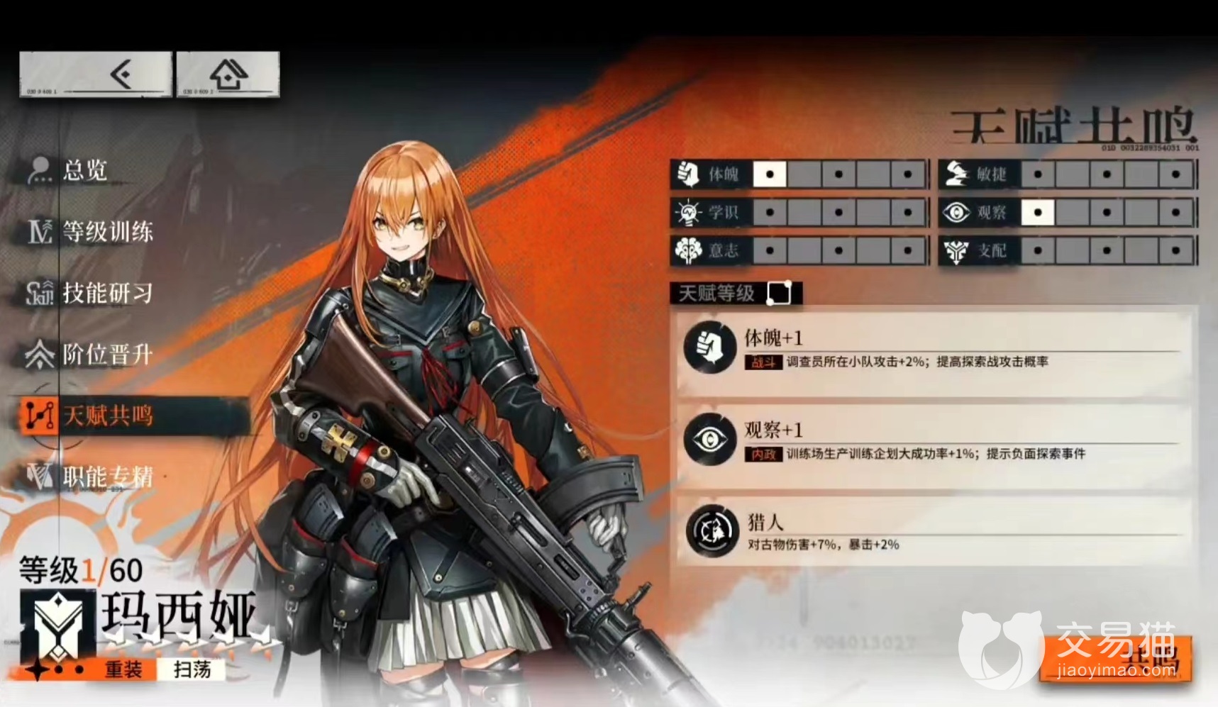 拥有的主要天赋包括体魄、观察和和猎人,猎人为对古物伤害有加成和暴击方面的加成。体魄主要增加的是小队攻击力和探索攻击概率,观察属于内政效果,在训练场生产训练成功率增加,提示负面探索事件。