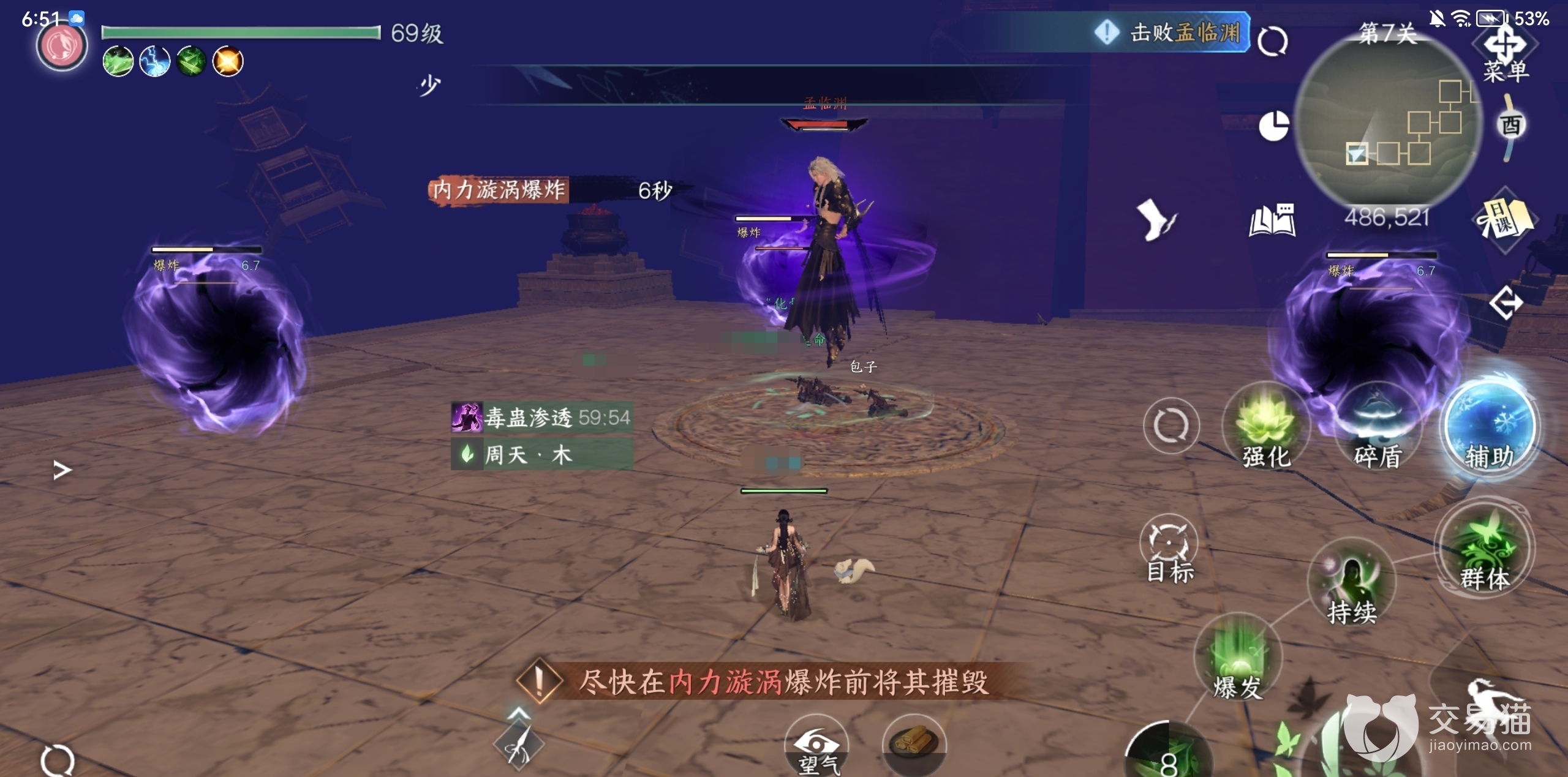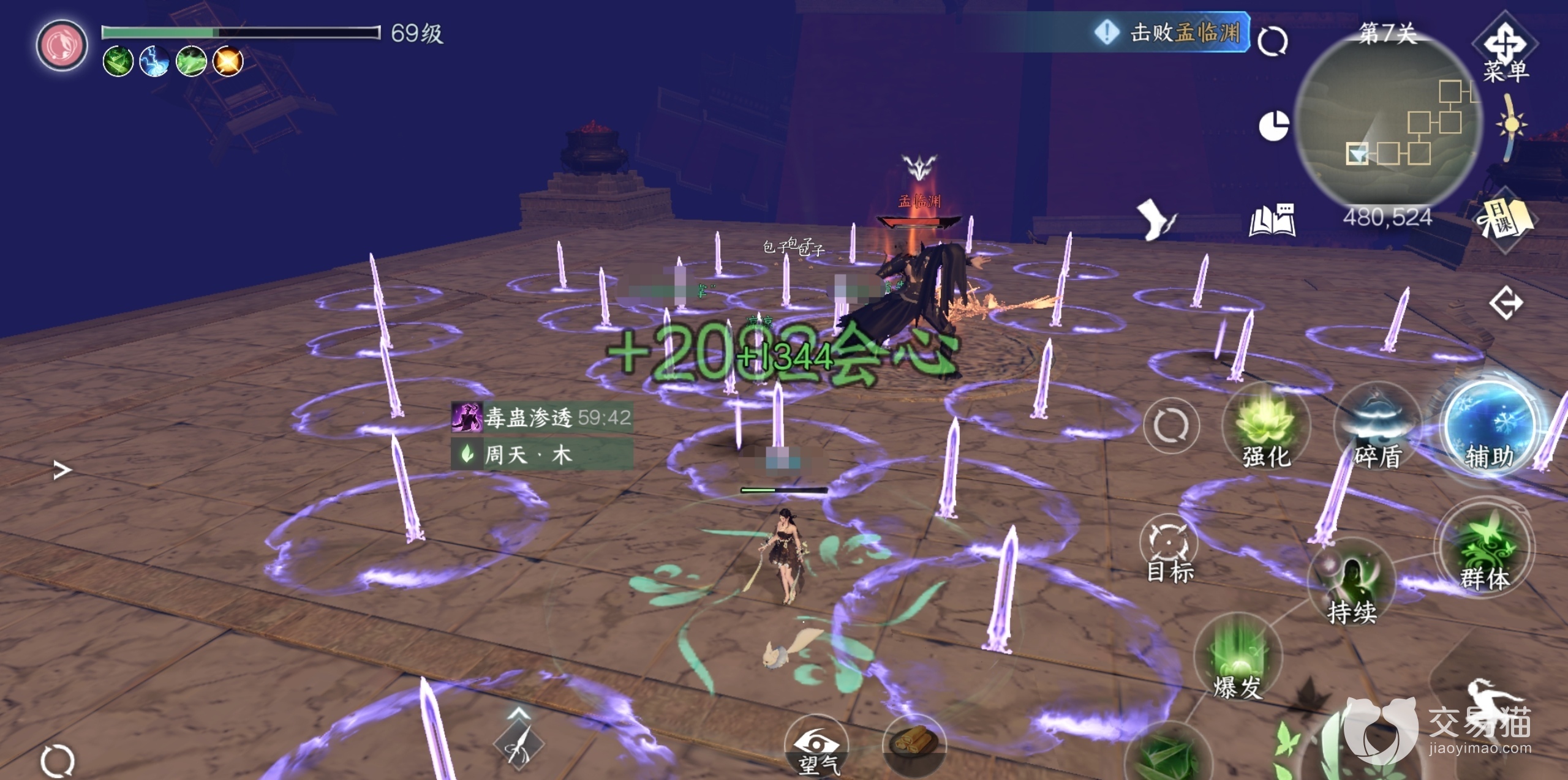 boss满血状态:第一个机制就是boss会在平台上召唤很多从地底向上发射的飞剑,与此同时需要躲避这些技能不然会造成大量伤害。第二个机制boss会朝一个方向发起一个轨道攻击,这个技能非常好躲,只要躲避就可以了,第三个机制boss会召唤三个内力漩涡,此时要集火攻击内力漩涡如果规定时间没有打破内力漩涡,会根据场上内力漩涡数量而规定伤害,如果一个都没打破会直接团灭。