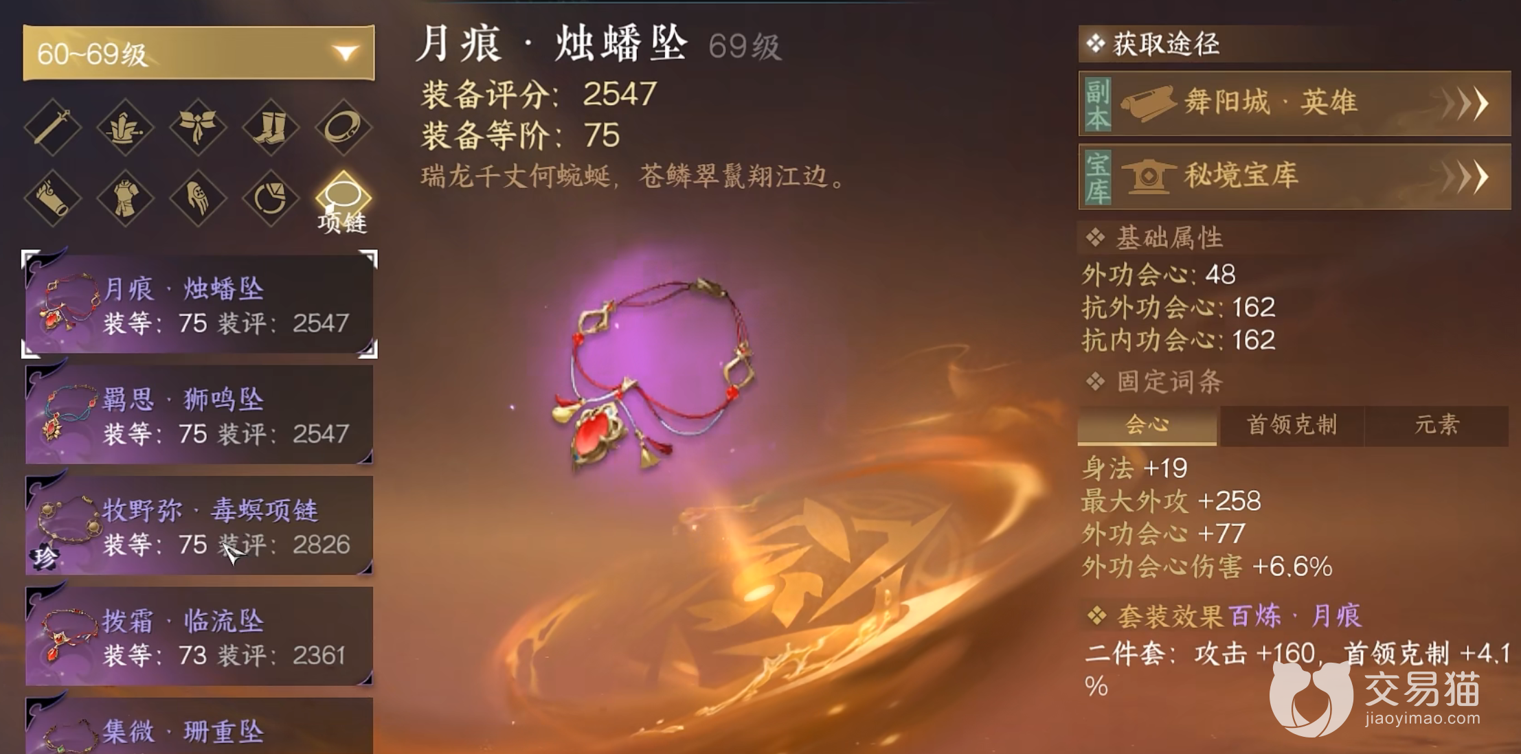 项链也是比较重要的,这类装备提供的都是关键的副属性,比如说会心,可以增加额外伤害的触发概率,携带月痕就是非常不错的选择,两件带套还有额外的攻击加成。