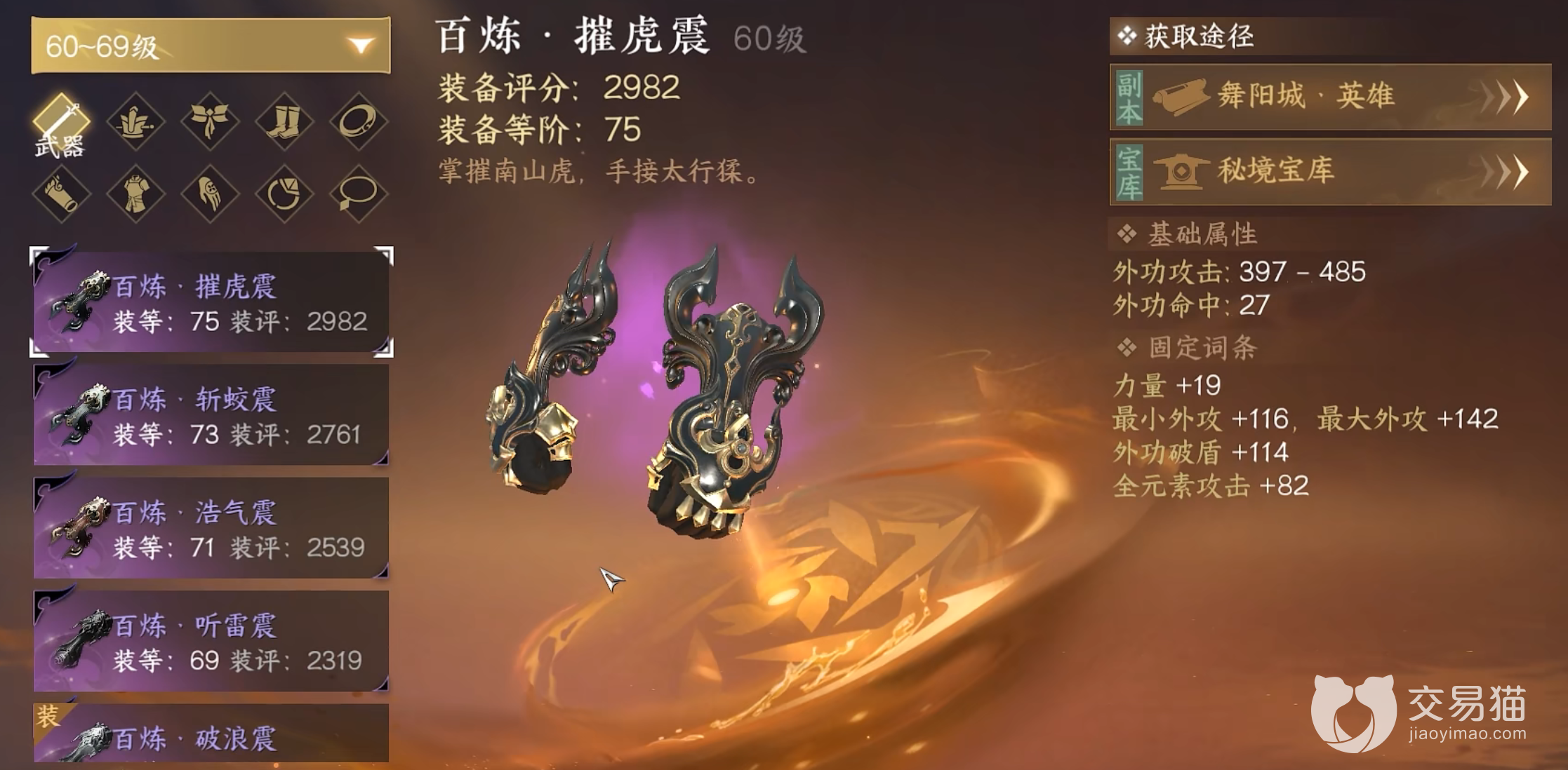 一个职业是可以装备十个位置的,首先最重要的还是武器,在这里选择摧虎震这把武器最好,可以提供给各位极强的攻击力最主要还有强大的破甲效果,当然优先选择评分比较高的装备会对各位帮助更大。