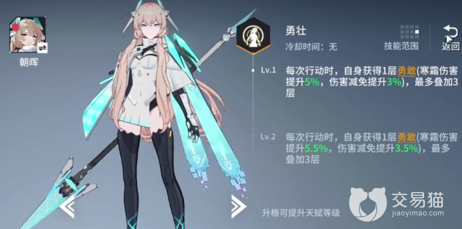 朝晖,作为冰系第二位输出单位,相比于冷蛟采用群体大范围输出为主,朝晖则更加倾向于单体的输出能力。而且角色本身技能buff方面自带于免伤和输出提升效果,这使得应对一些pve副本当中的强力boss敌人有着极大的发挥作用,甚至于某些极端情况下可以单刷某些boss。且自带一定的范围输出能力,以及对次要目标的伤害打击效果,值得培养。