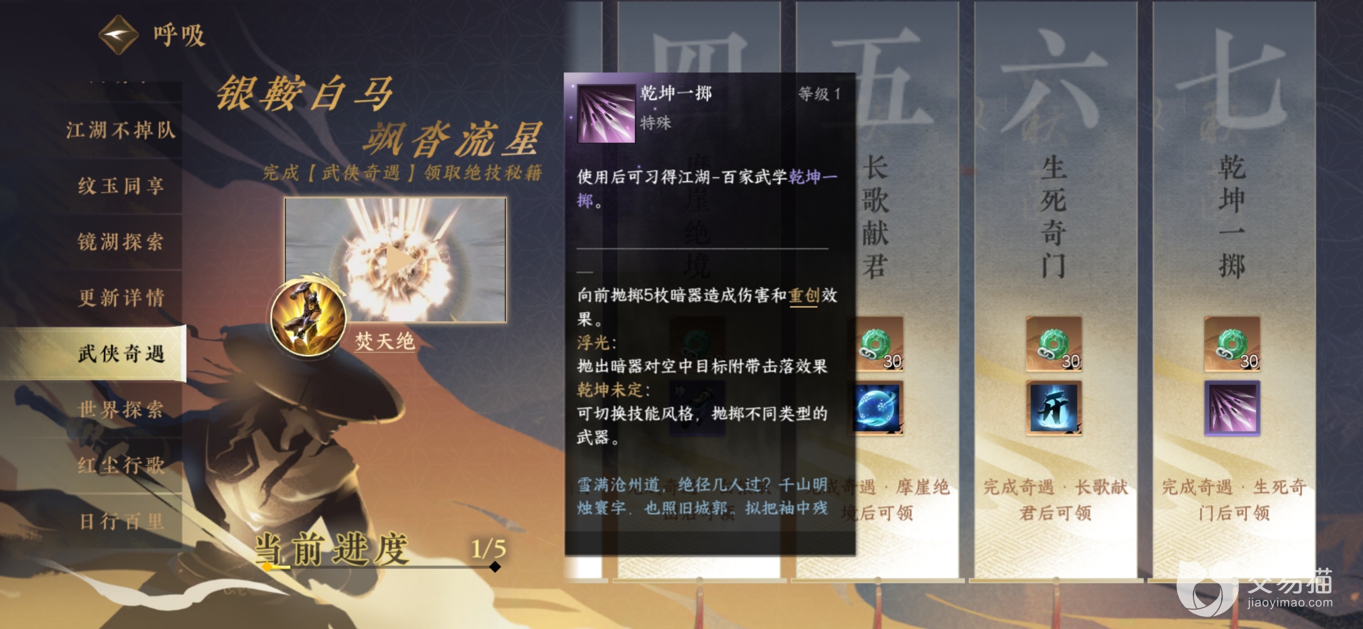 “乾坤一掷”这一武学的获取方式与其余武学有所不同,需要玩家自行手动接取,但不需要与NPC互动触发,玩家只需在主页进入“呼吸”这一页面,然后在其中找到武侠奇遇,便可直接领取相应任务。然后跟随任务剧情,在完成后便可获取这一武学。虽然获取方式简单明了,但美中不足的是,玩家需要大量时间,按照顺序去完成前面的任务,才可以接取这一任务。