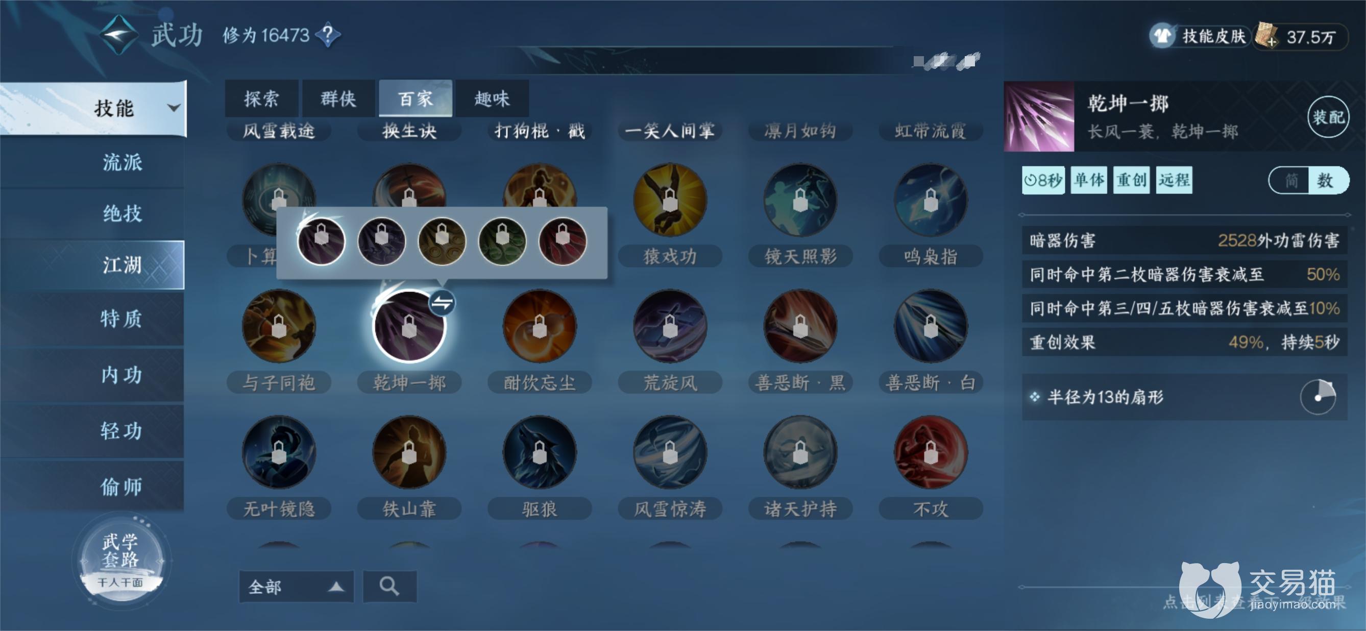 在完成“乾坤一掷”这一奇遇任务后,便可获取武学“乾坤一掷”,但是这只是基础版本,对于“乾坤一掷”而言,它还有四种分支等着玩家们去学习,玩家可以通过探险从而解锁。例如“乾坤一掷-羽”,便需要玩家花费时间,解开寒山书生的棋局来获取上卷,下卷则是通过在杭州(1150,1150)领悟棋局获得。