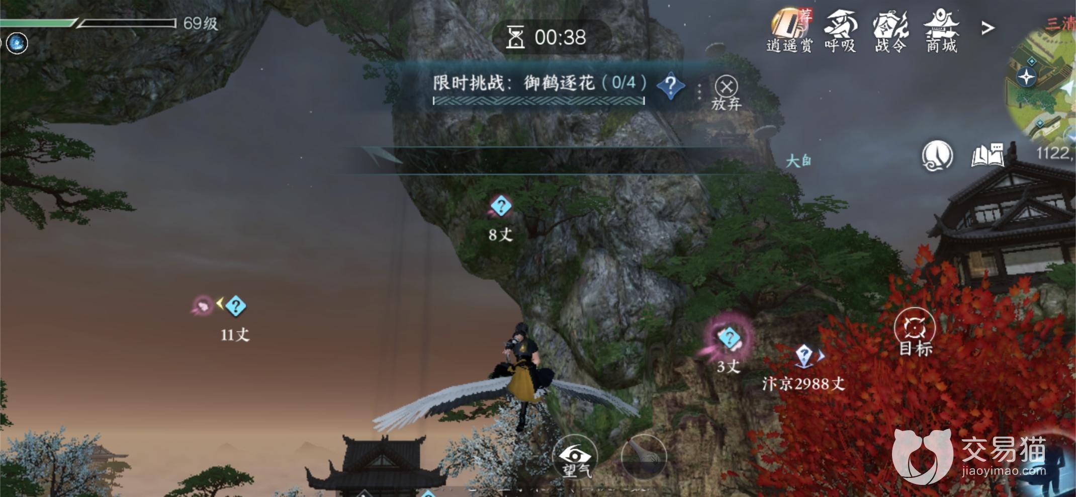 这类谜团很容易便被玩家发现,若玩家发现路边有着一只白鹤,靠近后选择骑乘,便会触发这一限时挑战,玩家只需根据系统的指引,骑着鹤去一一触碰空中花,便可完成这一挑战获取宝箱奖励。