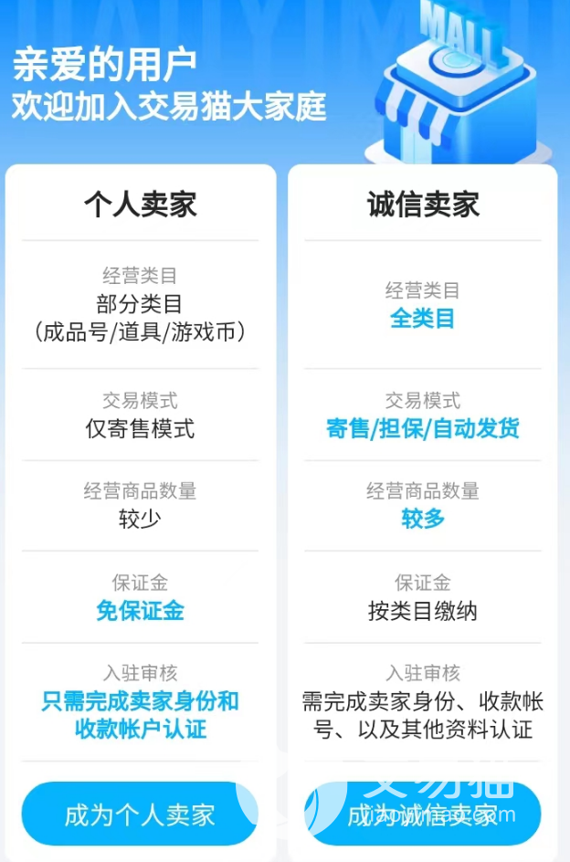 其次,卖号的玩家也需要通过平台去开通一个卖家身份。如果各位账号数量不多,且之需要处理游戏号一类的商品时,小编建议大家申请一个个人卖家即可。此身份的验证流程简单,玩家不用浪费太多的时间,并且平台也会提供多种基本的交易商品权限。