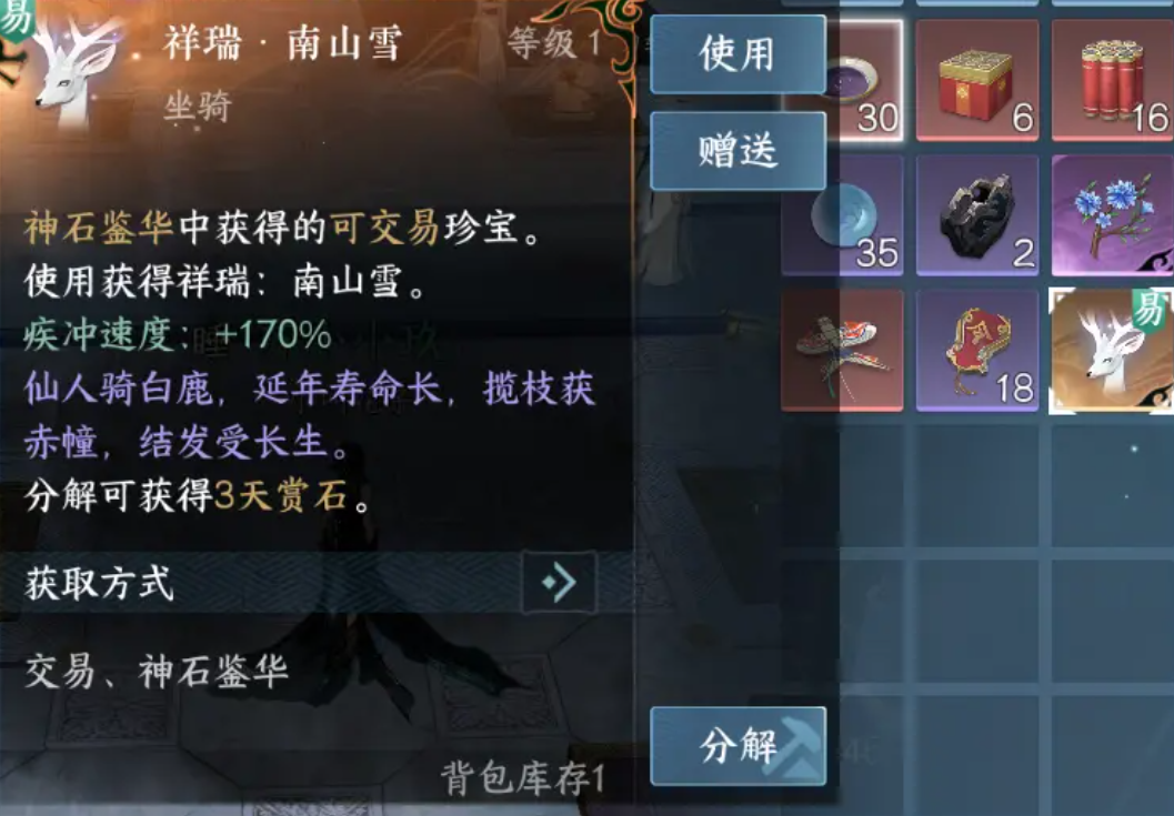 南山雪在游戏中的获取难度还是挺大的,玩家们需要去在【神石鉴华】里消耗【天赏石】来进行抽取,商城中是有天赏石出售的,玩家们如果铜币充足的话,可以拿铜币去购买,这个坐骑也有独特的加成,骑行后,点击加速会获得170%的疾冲速度。