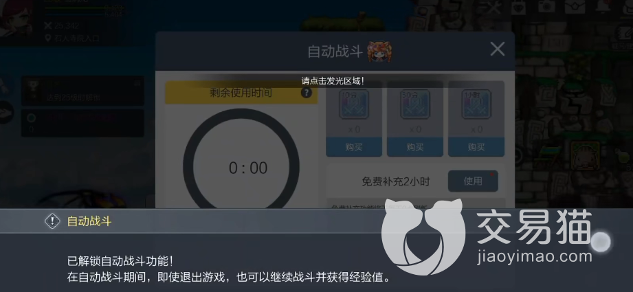 保证自己当天的两个小时没有用掉,大家首先去寻找一个合适的地图,确保身边的怪不能近身,或者是近身也打不死角色,这样的地点才是最适合的,最好是目前大家能打的等级最高的地图,这类地图刷怪得到的经验才是最高的,前置条件全部都确定之后,大家就可以在屏幕的右上方看到自动战斗的按钮。