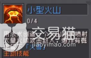 小型火山,正如其名字一般,释放后会创造一个火山对敌方单位造成持续伤害,在火山存在的时间里,火山会按一定频率爆发出火球对敌人进行攻击,在攻击的同时有一定概率产生“火苗”。