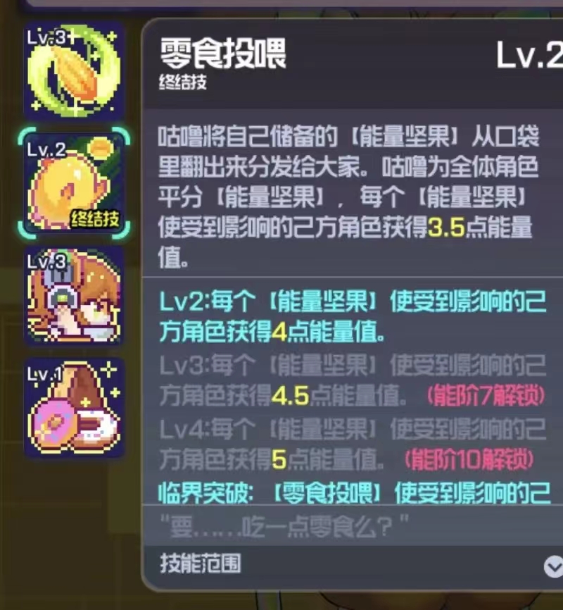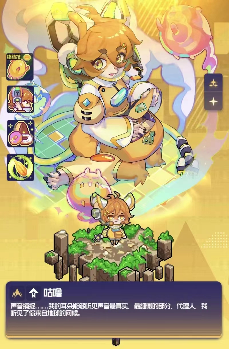 咕噜的常规技能是旋转瓜子,因为他是辅助在游戏中不太会有攻击敌人的情况。普攻带来相应伤害。咕噜的终极技能是零食投喂,必要时他会将自己储备的坚果翻出来分发给队友们,吃下后即可恢复全部实力,游戏过程中还会有相应剧情提示,增加玩家代入感。能力技能是情报监听,咕噜拥有顺风耳,可以聆听到千里之外的声音。他可以监听敌方动作,找到他们的弱点,提供战略思路。天赋技能是零食储备,开局拥有自己的零食背包(一个外形是坚果的背包),超级可爱。可以储备100个坚果,在战场上可以自动收入坚果。