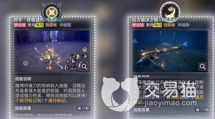 双必杀技能终极盛放和远古裁决还是非常强势的。被动技能,义肢改造,这个技能可以提升镰卫的自身生存能力。交相辉映能够增强胧月秘术的BUFF,大幅提升镰卫的辅助能力。