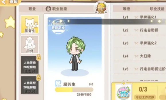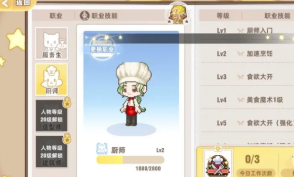 除了厨师和服务生这种相对比较基础的职业之外,还有两个需要玩家的游戏等级提升到20级,这就代表在这个时候已经拥有了完成游戏任务的能力,而且也对游戏的各方面设置都更加熟悉,这时候玩家就可以解锁建筑师和造型师,这两个职业要求玩家有独立的思想,并且有一定创造力,如果对这个职业职性质感兴趣的话,就可以来挑战一下。