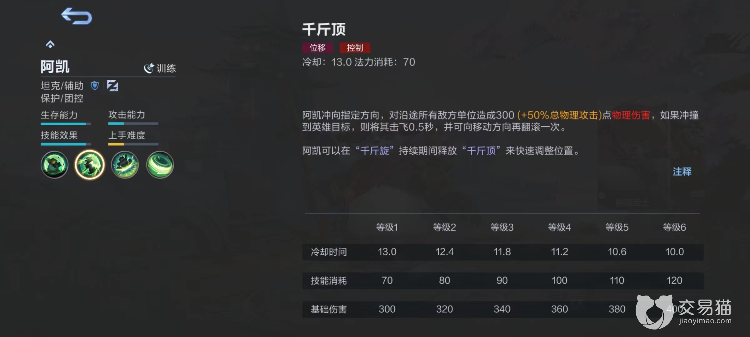 一技能千斤顶,指定方向之后开始向前冲刺,对遇到所有敌人都能造成伤害,如果撞击到敌方英雄目标则将其击飞。不仅是很好用的,位移技能,击飞之后起到的控制效果也很关键,最重要的是出其不意,是非常合适的先手技能。第2个千金压,群体伤害依靠自身体重砸向地面,对敌人造成物理伤害后附加减速效果,持续两秒钟。因为范围比较近,所以往往和千斤顶合起来使用,这样才能保证命中敌方关键目标,利用附带减速可以很好黏住令对方难以逃脱。用来先手控制也可以舍身救法师或者是射手。