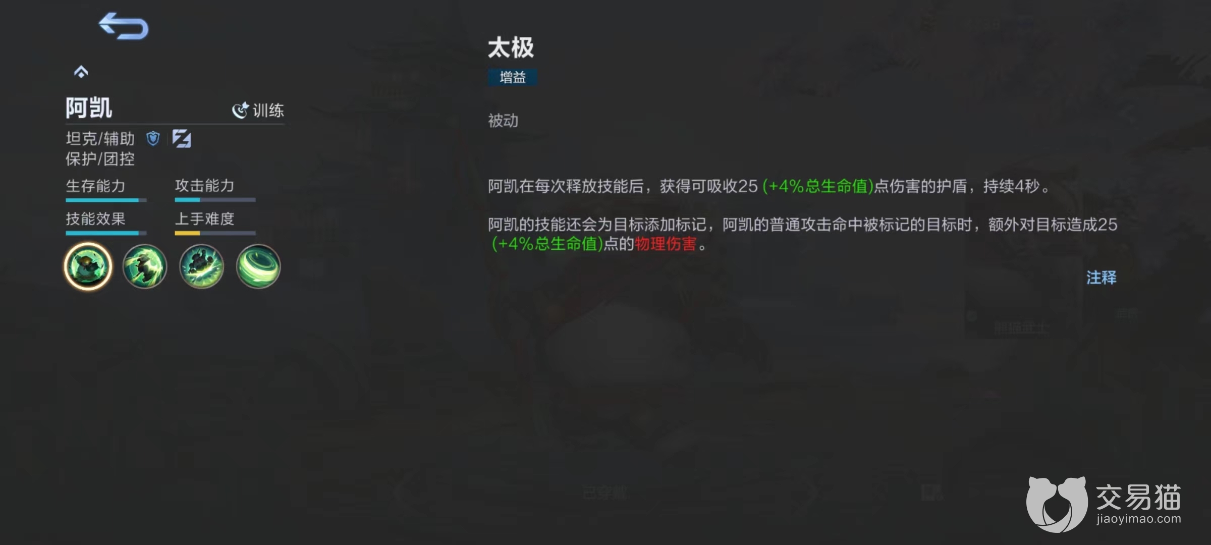自身被动为增益效果,在每次释放技能之后自动生成护盾,虽然护盾在前期并不算可观,但是后面如果出一些叠加生命值的装备,那么就变得比较硬。如果不被击破,最多持续4秒钟,另外自身技能释放之后还会为攻击目标添加上标记,后续利用普通攻击命中目标时有额外物理伤害,此物理伤害在数值方面和自身添加护盾相等,都和总生命值相关。所以在使用方面,熊猫武士应该频繁释放技能,利用生成的护盾去和对方换血,这样才能积累起优势。