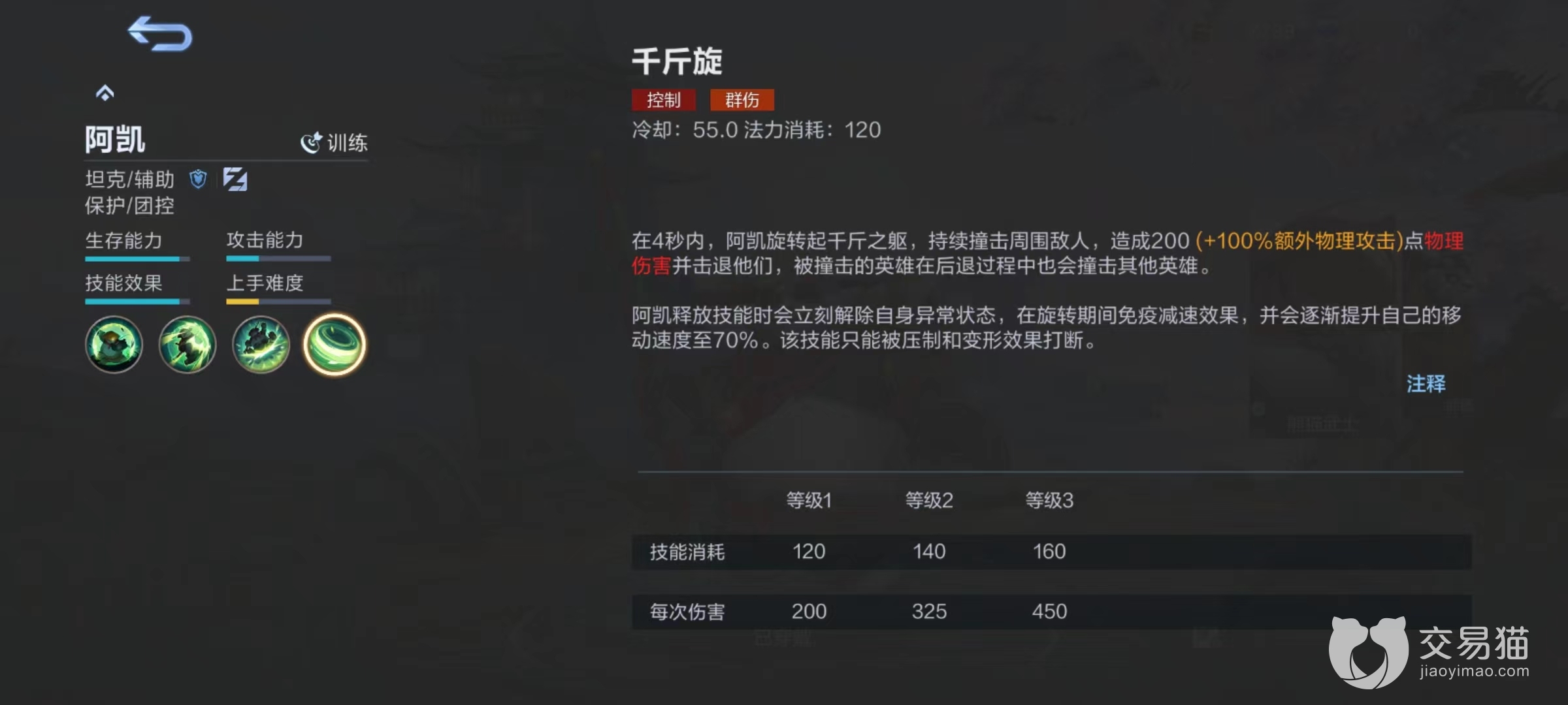 最后是大招千金旋,旋转者持续攻击周围敌人,在技能释放过程中可以移动,而且免疫减速效果,并且会逐渐提升自己的移动速度。所以该技能使用效果非常丰富,既可以当做单纯范围伤害,又可以用来解除各种各样控制效果,或者是利用提高移动速度去追上逃跑的敌人。
