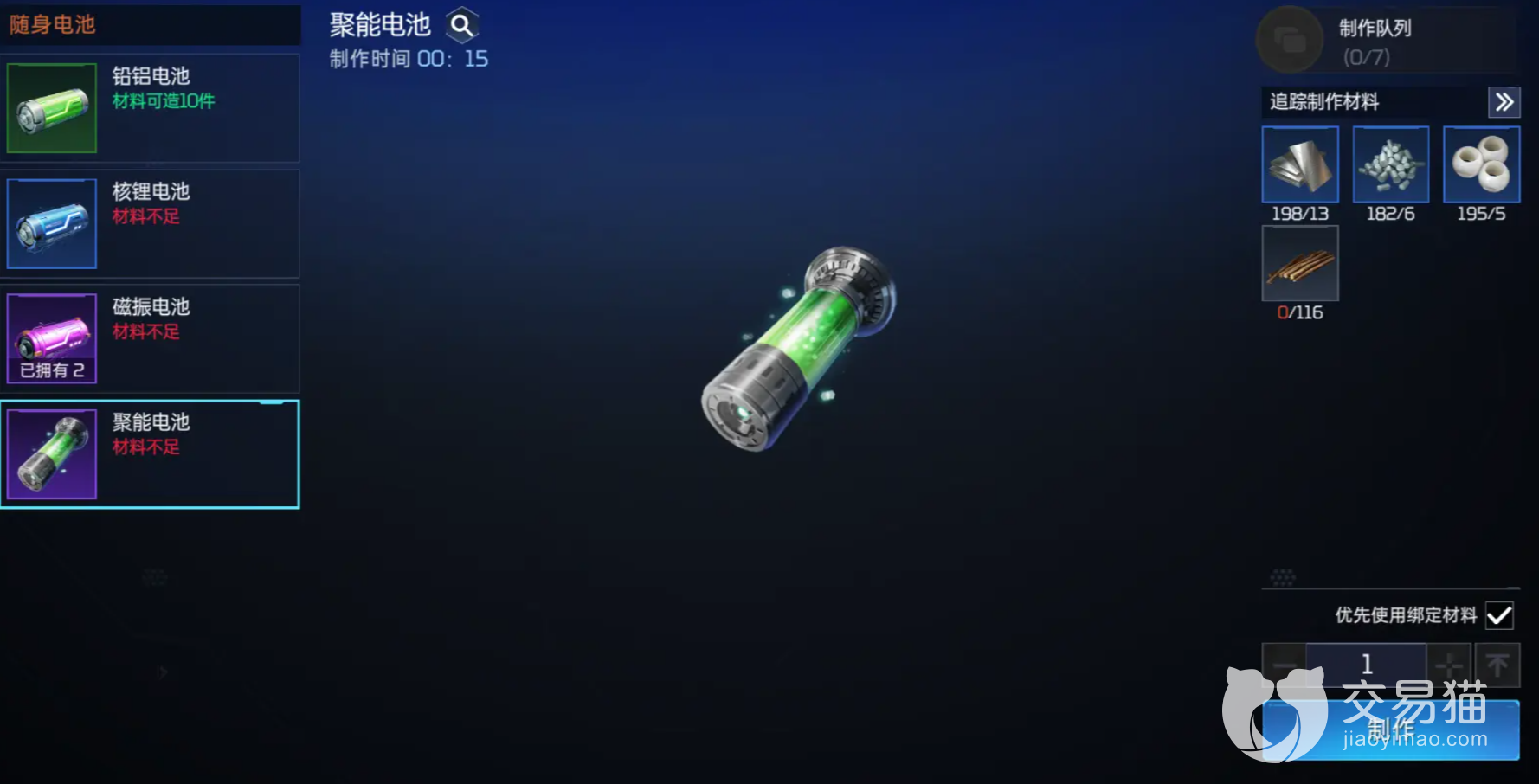 电池方面,从基础的铅铝可以最多升至顶级的聚能电池。玩家们可以用更高级的材料在装备制作台界面进行更高品质的电池制作,这样的话能够额外提升我们可携带的电池上限。