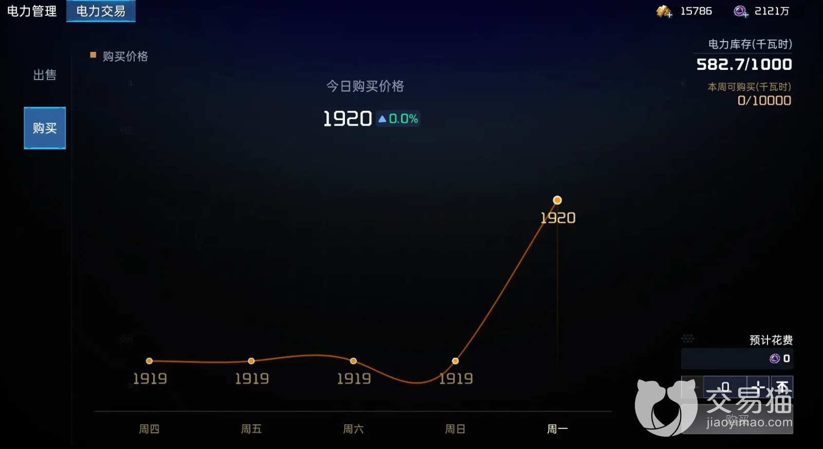 当然,作为这么重要的资源,玩家们也是可以通过交易来购买或卖出。一部分没有什么精力去采集材料的玩家,可以直接通过购买来获得。入电力交易模块在这里将以联盟点数为基础货币进行电力的购买和出售,当然,如同其他商品一样,该资源的购买和出售也会根据服务器的需求来进行浮动。